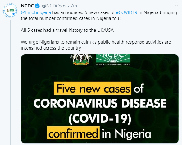 No fewer than five new cases of Coronavirus have been confirmed in Nigeria bringing the total of persons with the viral diseases in the country to Eight as announced by the Federal Government.