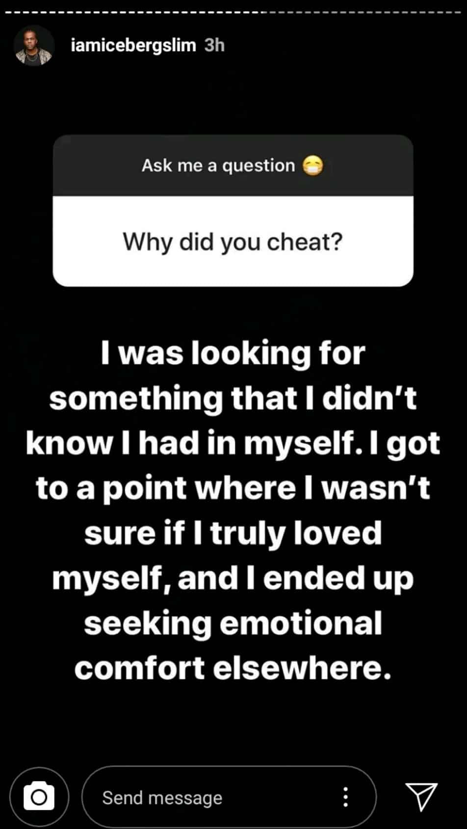 Iceberg Slim has finally opened up on why he cheated on popular Ghanaian actress, Juliet Ibrahim.