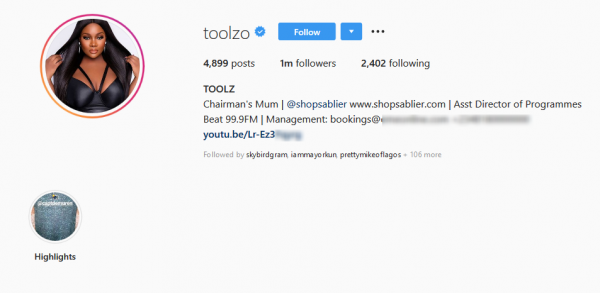 Toolz, whose Instagram handle contains her husband’s name Tunde Demuren in the past now shows just her name on the handle.